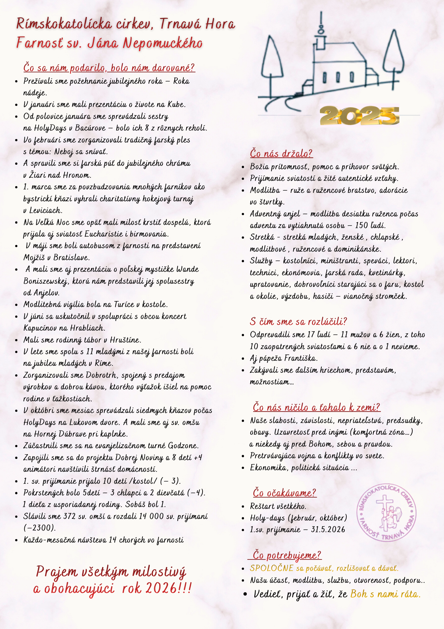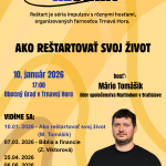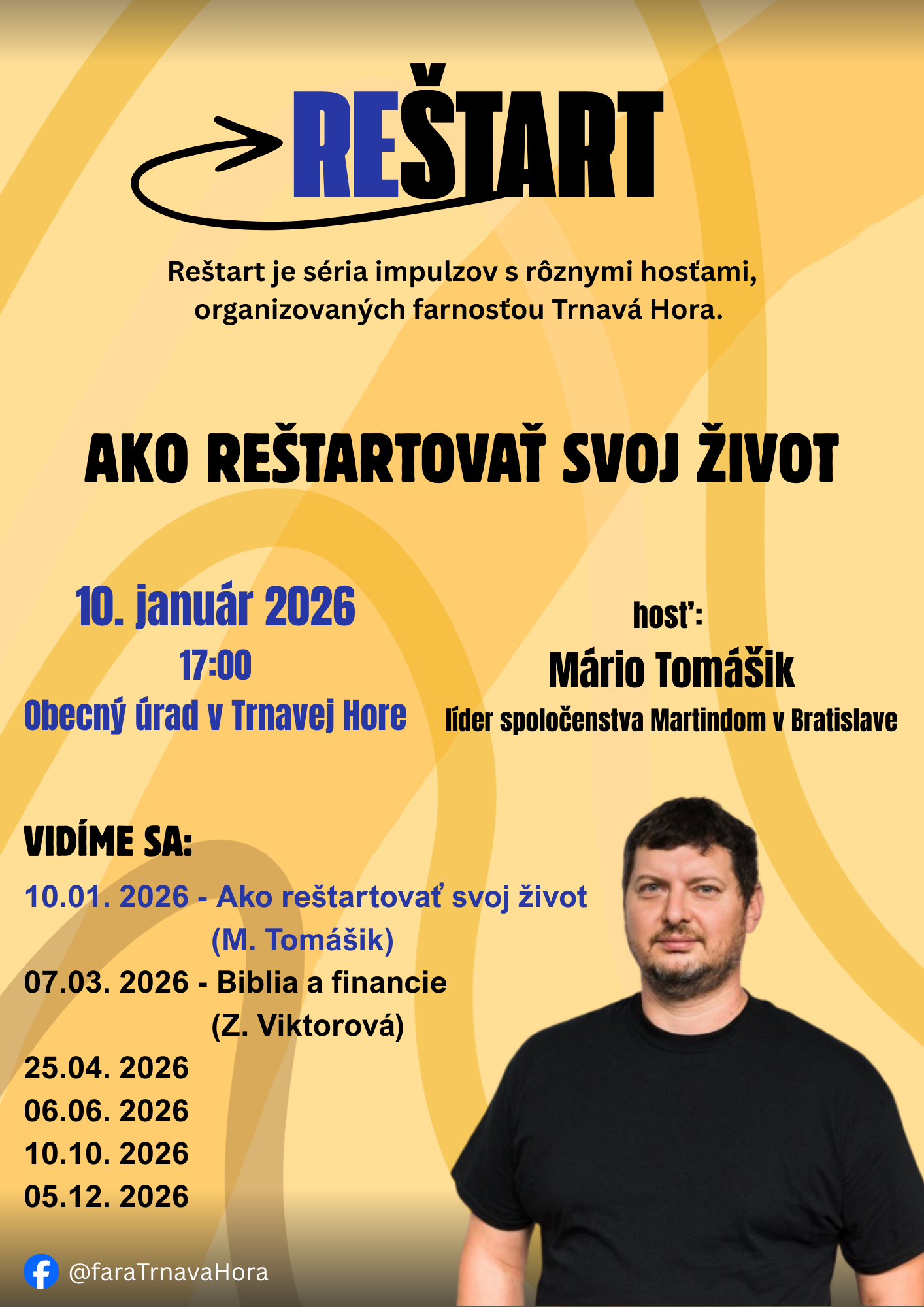 Od januára 2026 začíname v našej farnosti prednáškovo-diskusný projekt REŠTART. Budeme si pozývať zaujímavých hostí na rôzne témy života. Určený je pre každého bez rozdielu veku či vierovyznania. Cieľom je priniesť impulzy do života, ktoré nás môžu posunúť a niečo pozitívne naštartovať či reštartovať. Prvým hosťom bude líder spoločenstva pri Dóme sv. Martina – Mário Tomášik. Stretnutie bude v sobotu 10. januára o 17:00 na Obecnom úrade v Trnavej Hore.